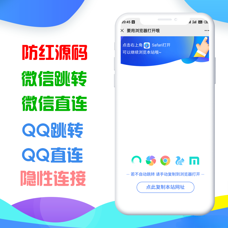 该源码的主要功能是利用一个新域名(网址)A作为落地域名,通过在QQ或微信中打开,提示用户使用浏览器打开,跳转至目标域名(网址)B,从而实现防红效果,保护目标域名免受封锁。