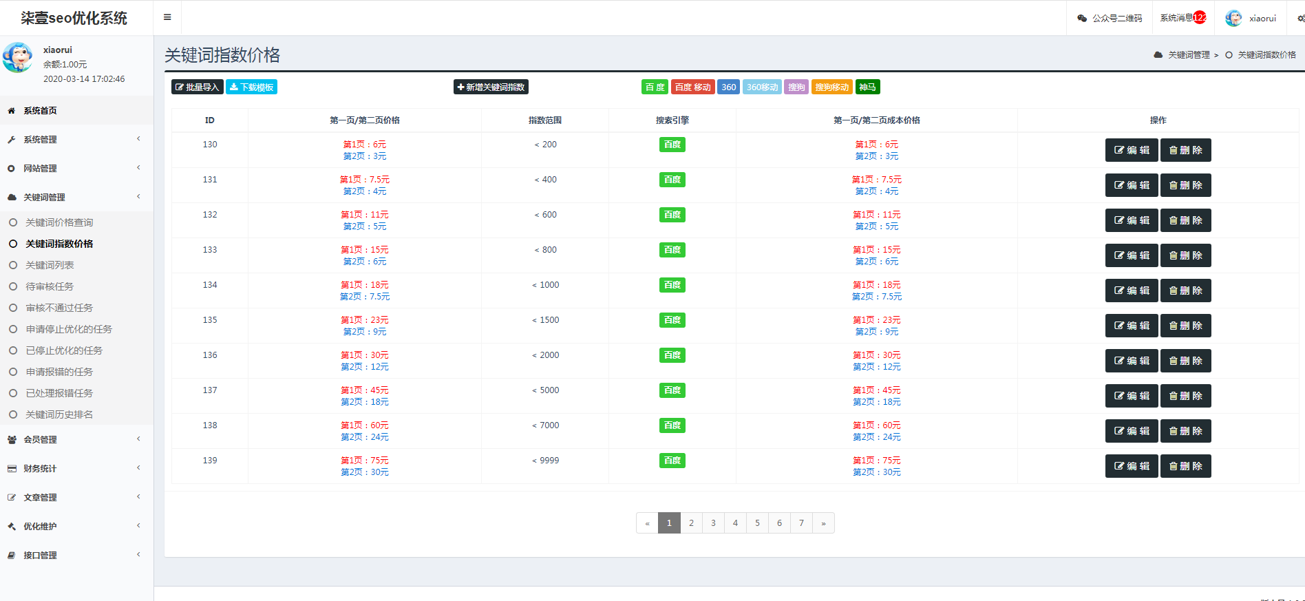 网站管理:允许总站、代理、普通用户添加和管理网站,并提供详细的统计数据,如域名、关键词数量、消费情况等。